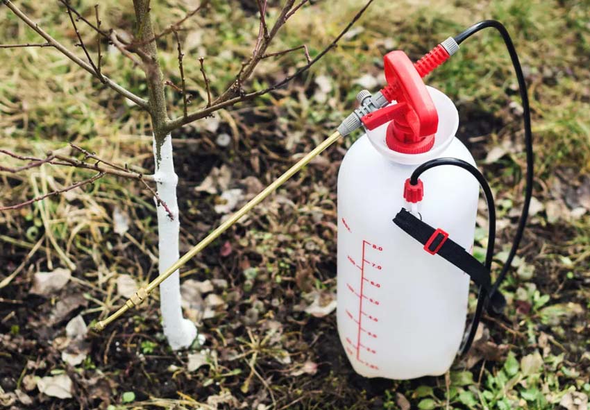 Некоторые садовые опрыскиватели, кроме химических препаратов, могут наносить побелку. Для этого в комплекте идет специальная насадка.
