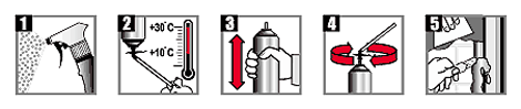2. Натуральным образом довести баллон до комнатной температуры. Температура применения: от 0°C до +30°C, температура баллона от +10°C до +30°C. Для зимних монтажних пен температура применения: от -10°C до +30°C, температура баллона от -8°C до +30°C.